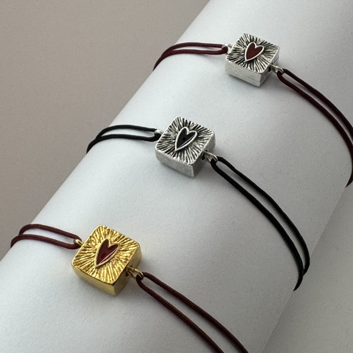 Επάργυρο-Μαύρη καρδούλα, Επάργυρο-Κόκκινη καρδούλα, Χρυσό-Κόκκινη καρδούλα |